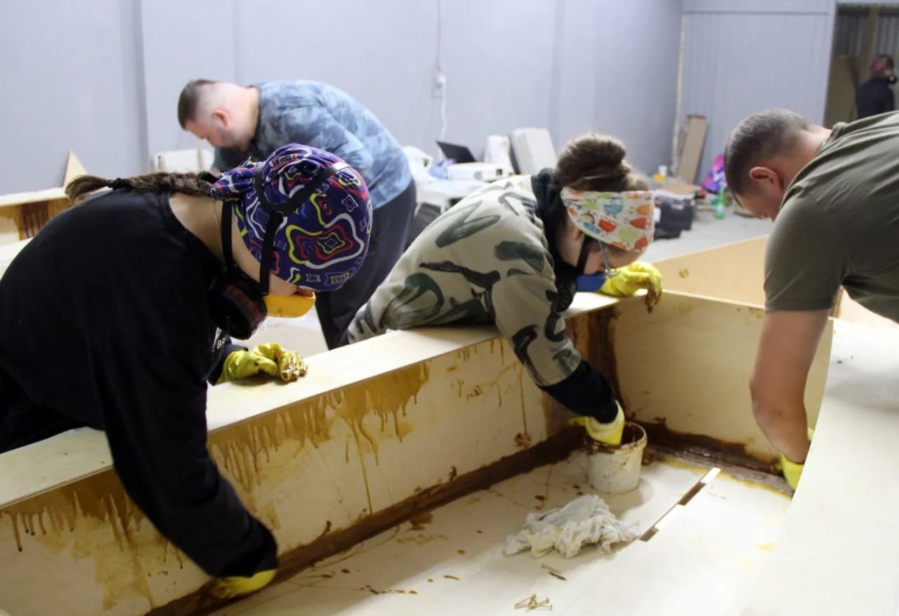 На третьем сборе было особенно интересно и... не удобно. Интересно, потому что мы из кондитерских мешков выдавливали смолу в стыки корпуса. А не удобно, потому что мы работали в респираторах, а в них было очень душно.