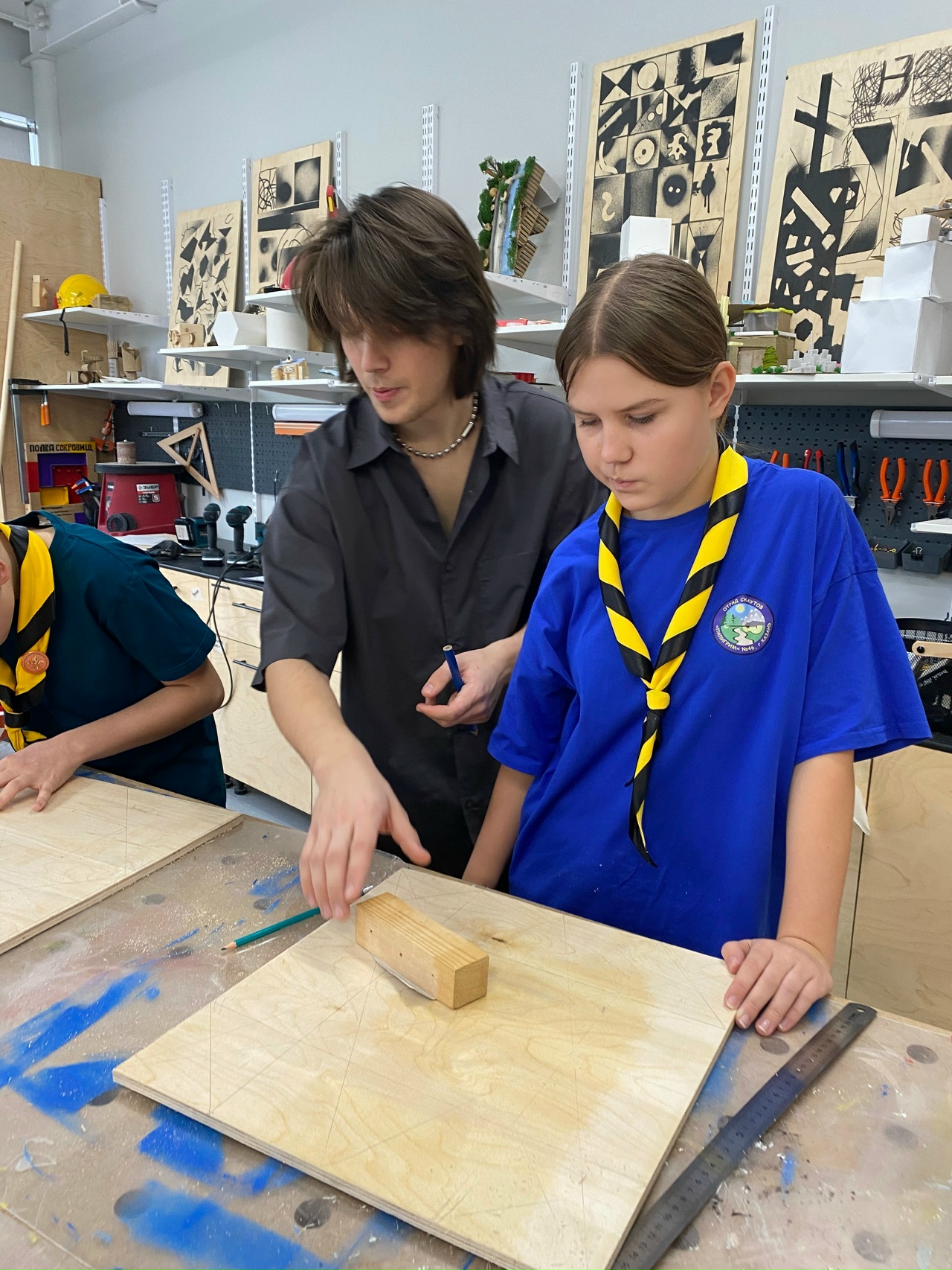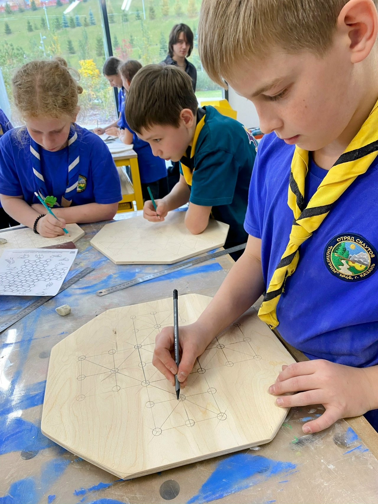 Ребята разных команд уже смастерили комплекты Удмуртской пазьгыса-шудон, и раскрасили ракетки для волчков, уже выпиливают и подготавливают биты для лапты и чижа.